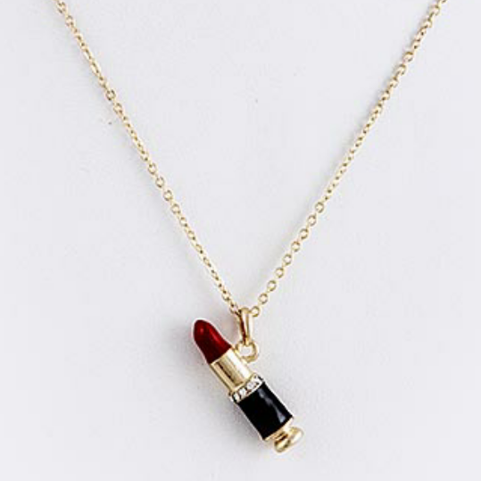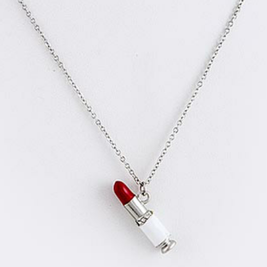 -Length: 20" approx-lobster claw clasp; small sized lipstick charm. -Available in White/Silver, White/Gold, Black/Silver, and Black/Gold